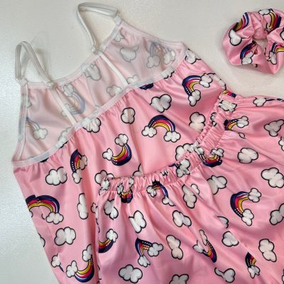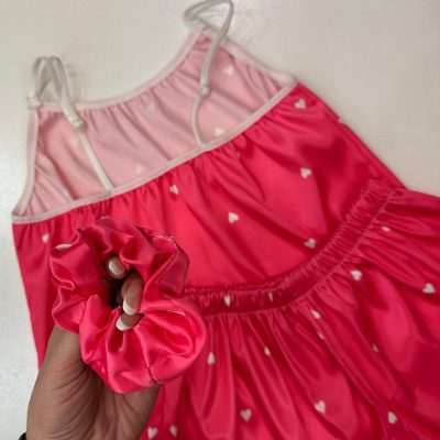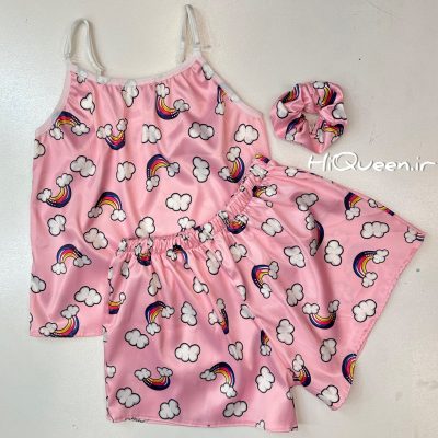 ست ساتن ۳ تکه شامل تاپ و شورتک و کش مو بند سرشانه قابل تنظیم زمینه صورتی کمرنگ با طرح