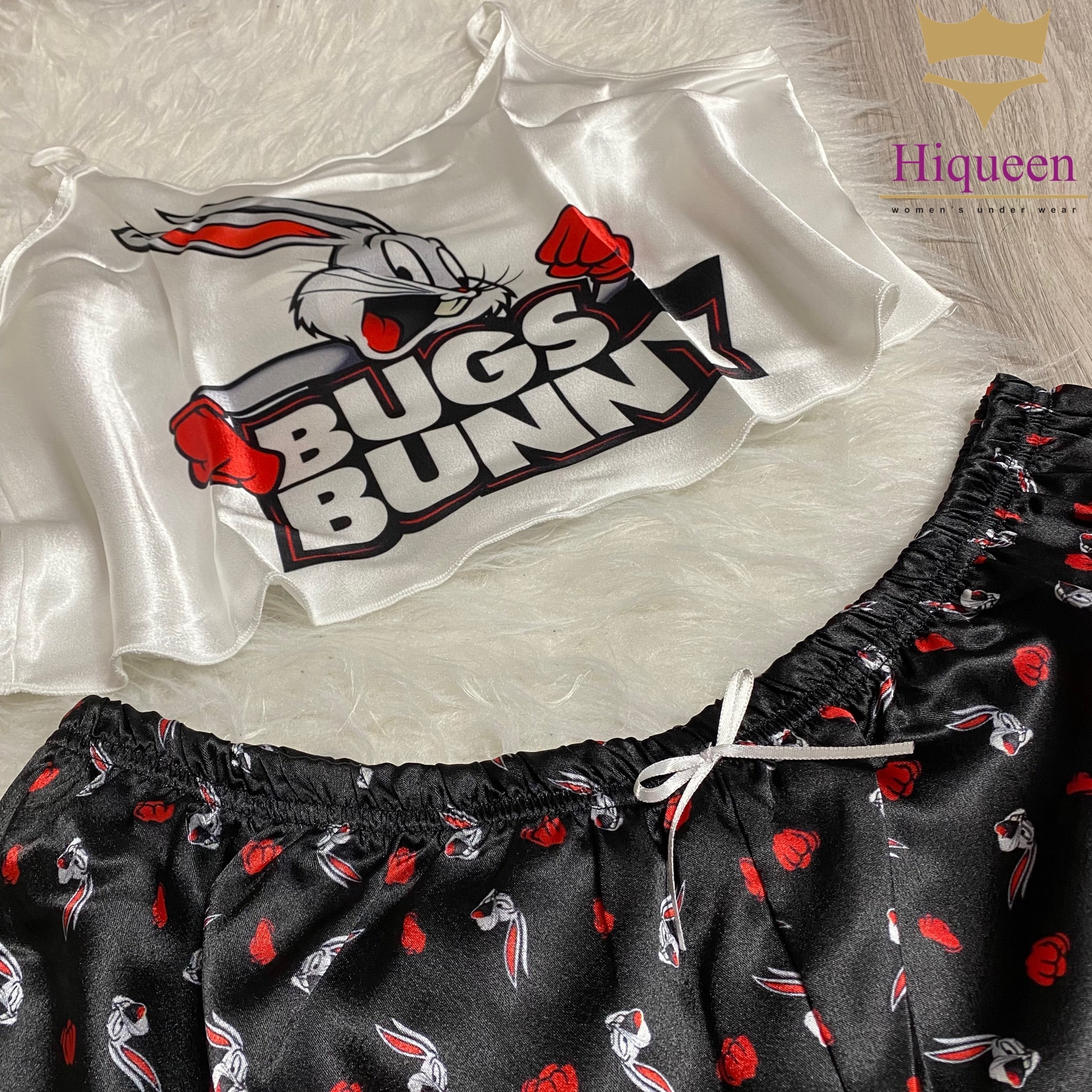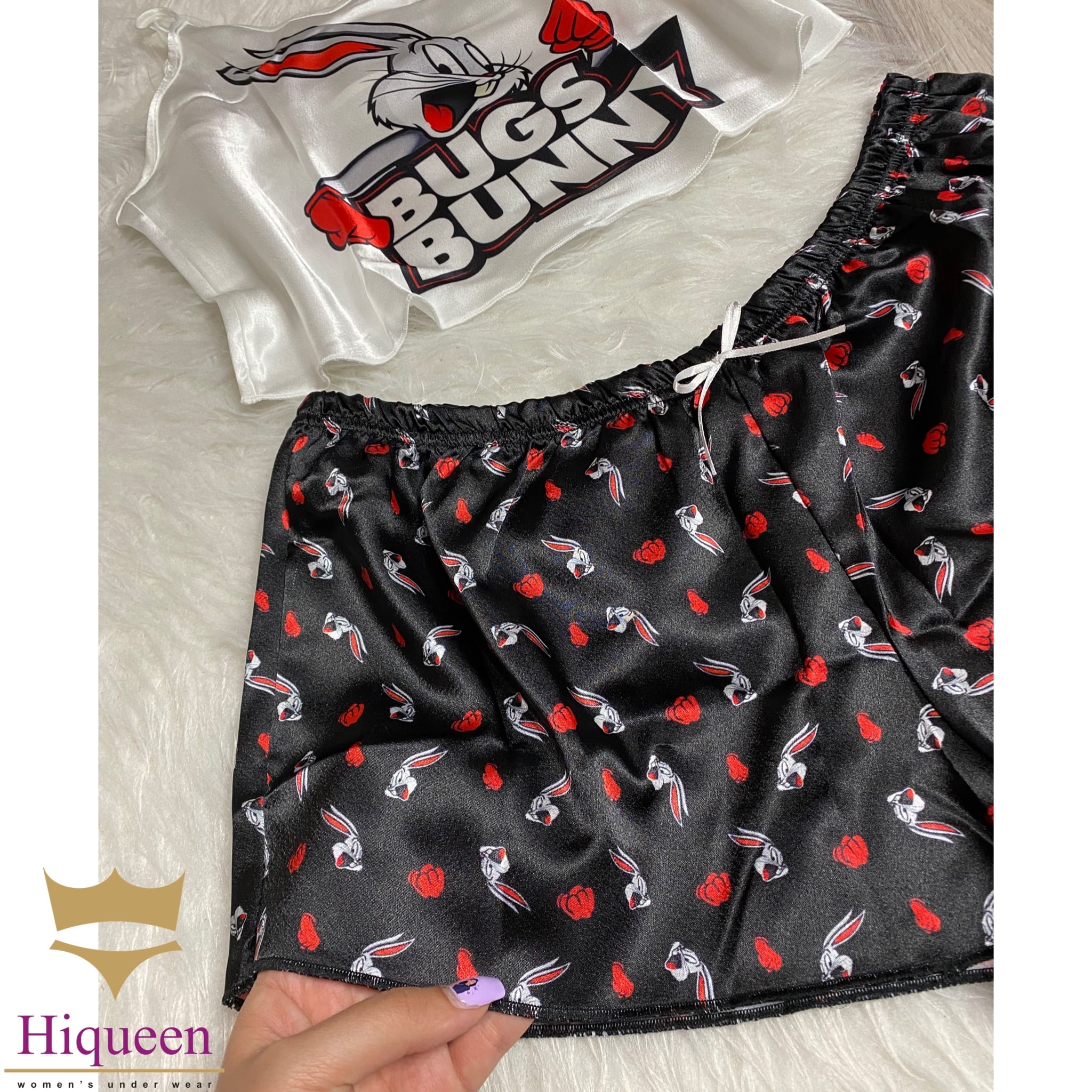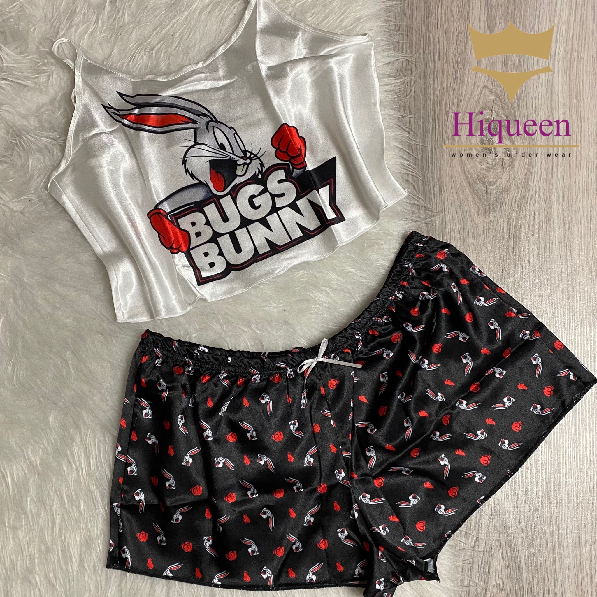 ست ساتن Bugs Bunny مدل نیمتنه شورتک از برند معتبر Angel، انتخابی فانتزی و جذاب برای خانمهایی است که به استایل خاص و شاد علاقهمندند. این ست با طراحی کارتونی و رنگهای چشمنواز، حس لطافت و طراوت را به لحظههای استراحت شما میآورد.