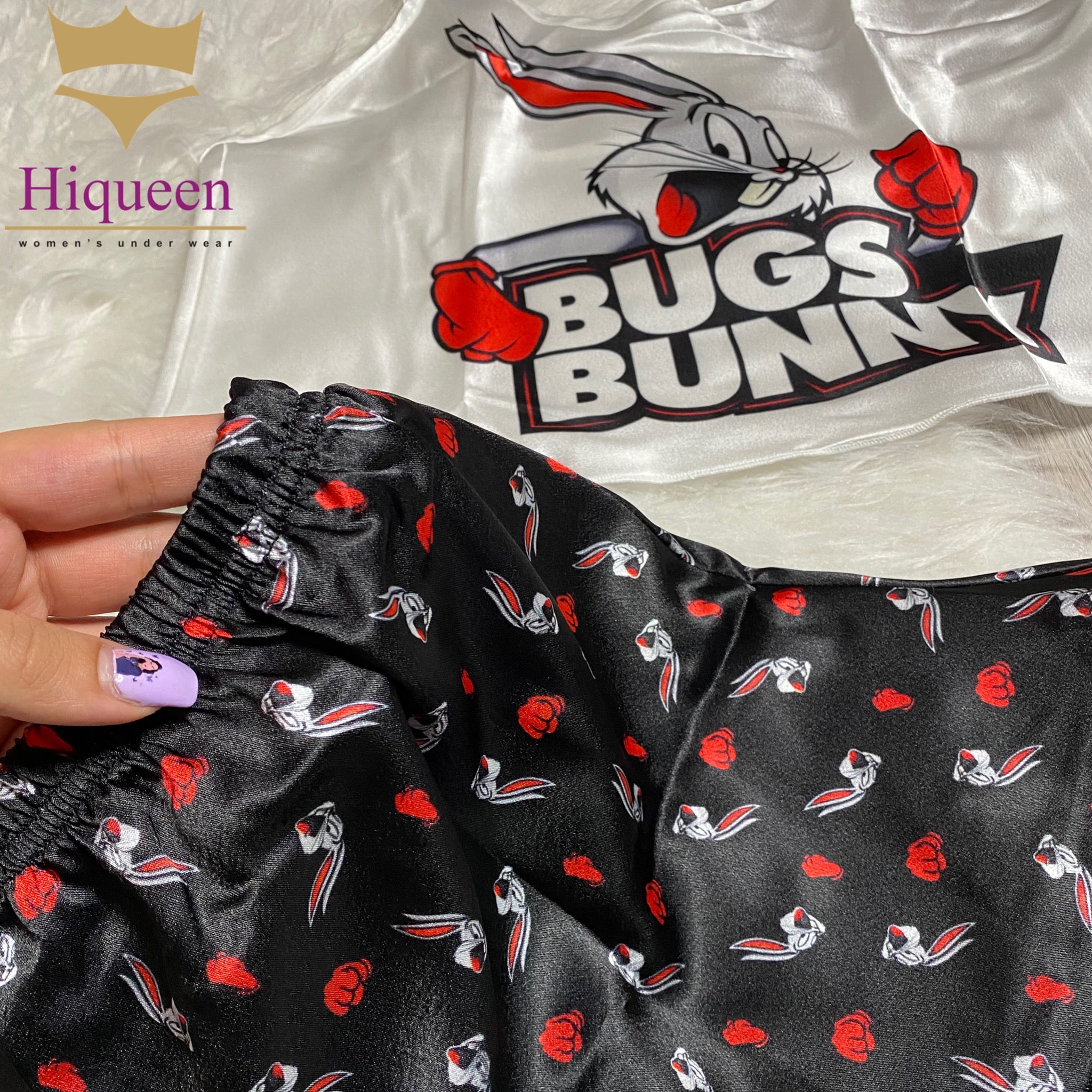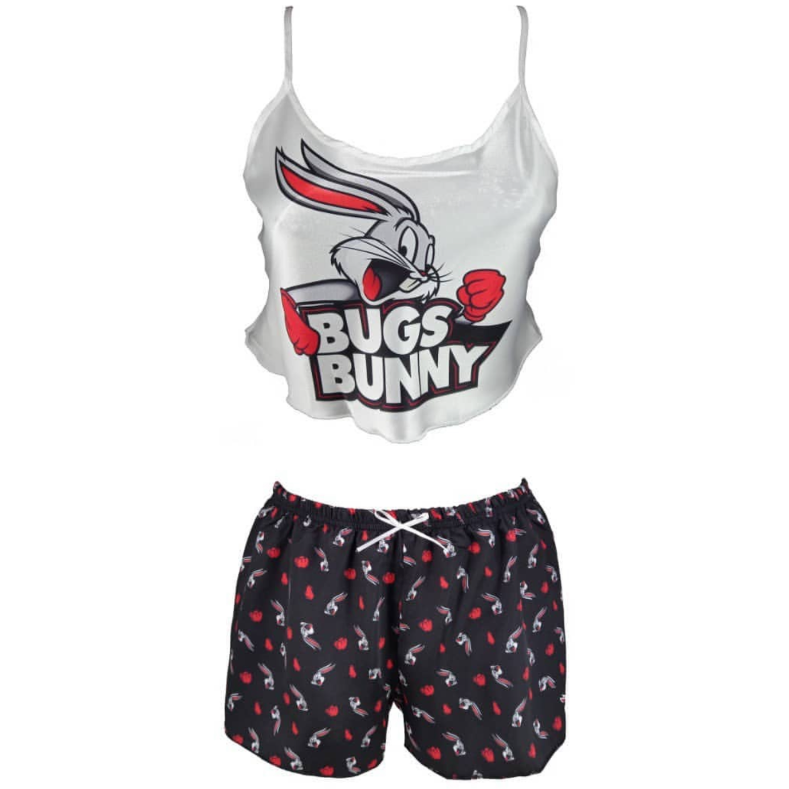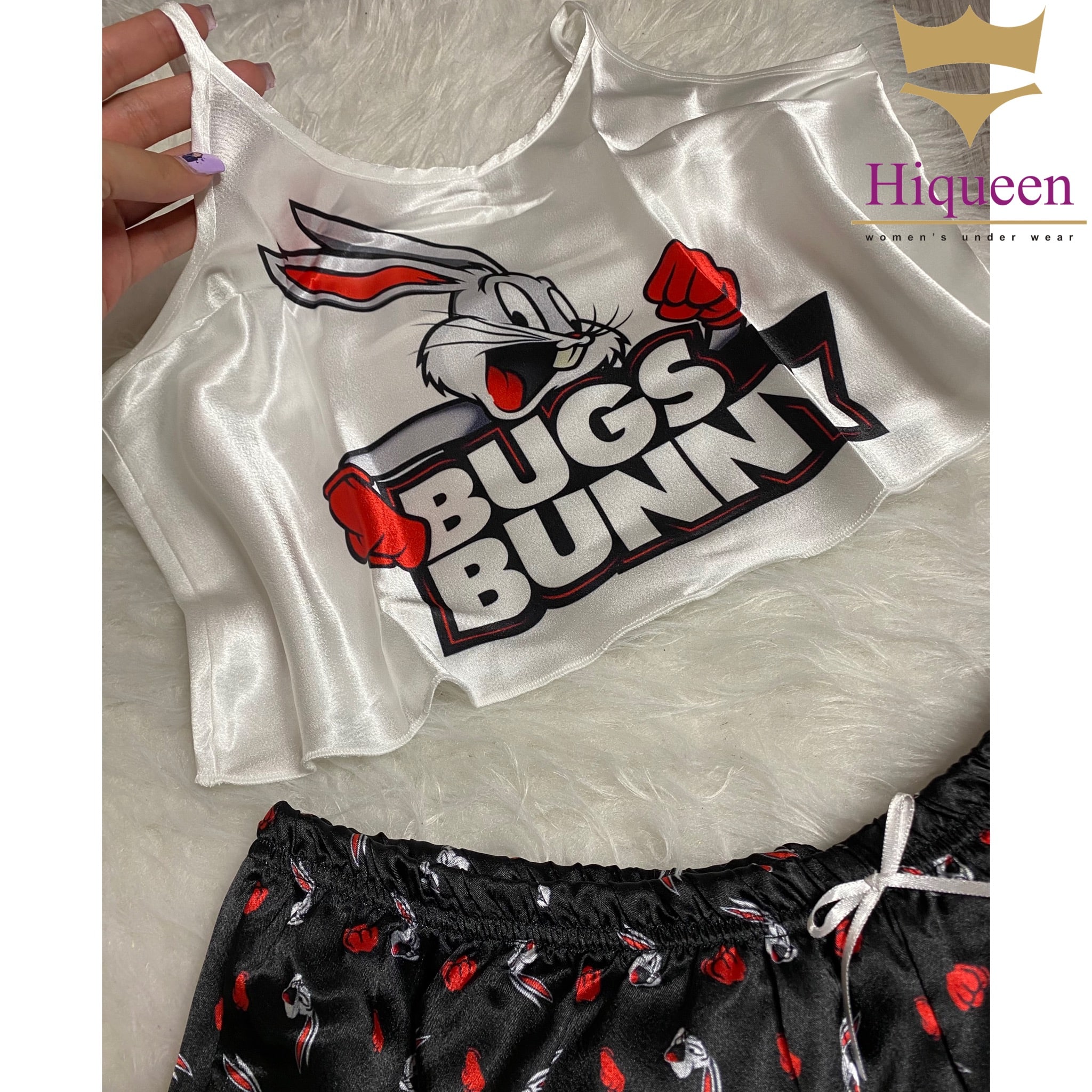 ست ساتن Bugs Bunny مدل نیمتنه شورتک از برند معتبر Angel، انتخابی فانتزی و جذاب برای خانمهایی است که به استایل خاص و شاد علاقهمندند. این ست با طراحی کارتونی و رنگهای چشمنواز، حس لطافت و طراوت را به لحظههای استراحت شما میآورد.