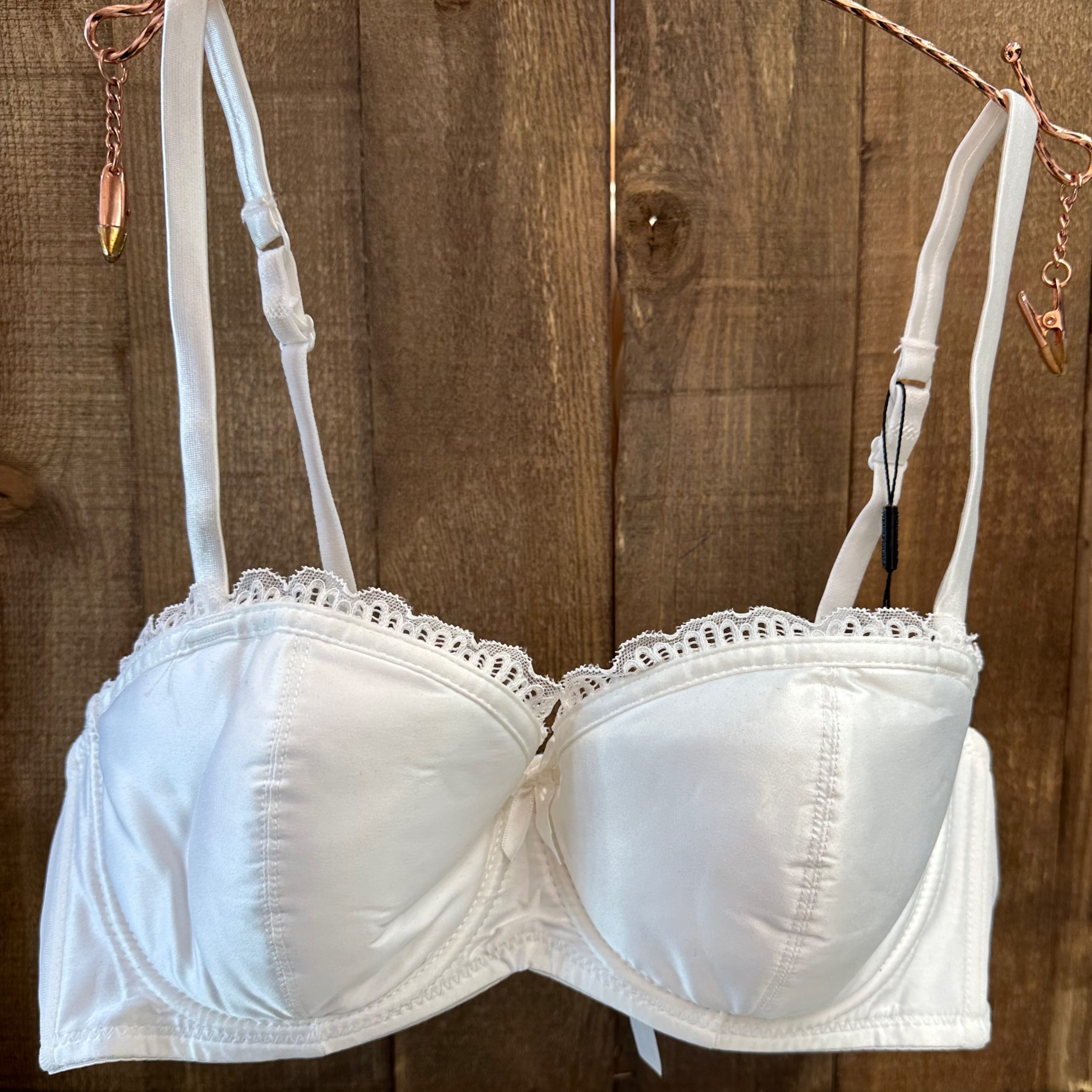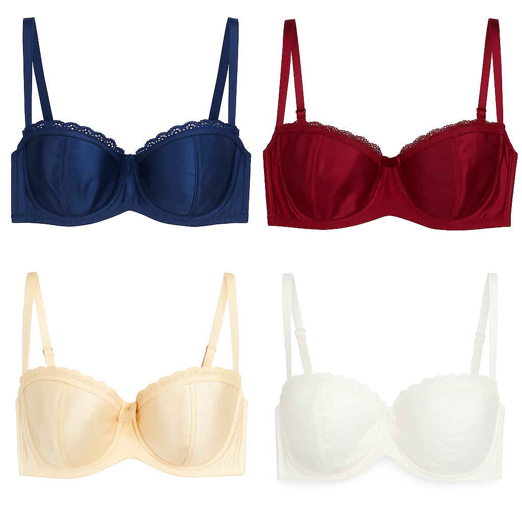 سوتین بالکنی ساتن با کاپ C، لایه‌نازک و فنردار؛ داخل کاپ نخی، بند سرشانه ثابت و قابل‌تنظیم. سایزبندی ۷۵ تا ۹۰ در رنگ‌های سرمه‌ای، زرشکی، سفید، صدفی و کرم.